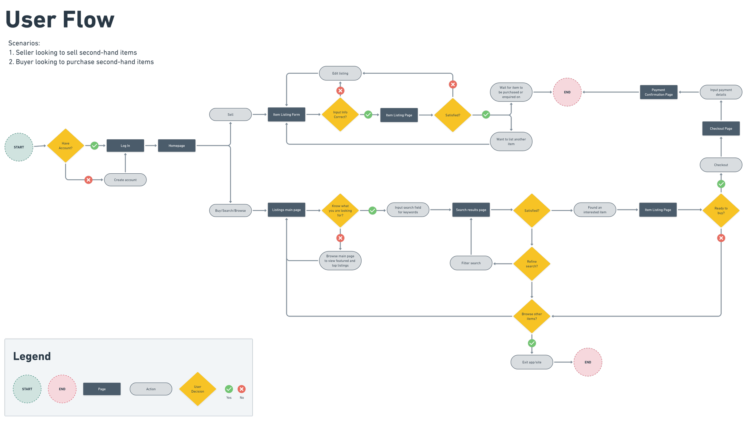 The user flow takes us through the journey of a typical user and the decisions they make along the way. By mapping this out, we are able to streamline unnecessary steps and make the user journey as smooth as possible.